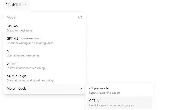 Pro、Plus 和 Team 用戶可以通過“More models”下拉菜單立即選擇該模型,而 Enterprise 和 Edu 用戶預計在未來幾周內獲得訪問許可權。同時,GPT-4.1 mini 取代了 GPT-4o-mini,並向所有 ChatGPT 用戶開放。