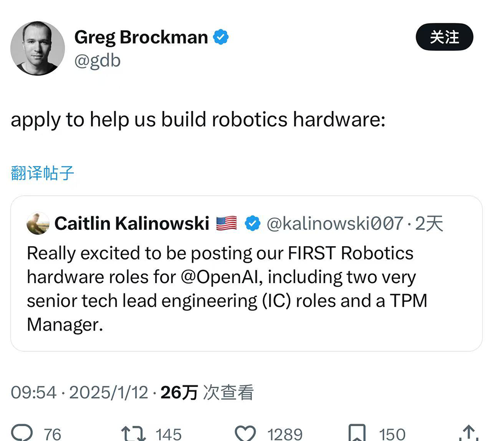1月12日,OpenAI聯合創始人兼總裁Greg Brockman在社交網站轉發了一條正在招聘硬體工程師的消息,這意味著OpenAI正式回歸機器人賽道。